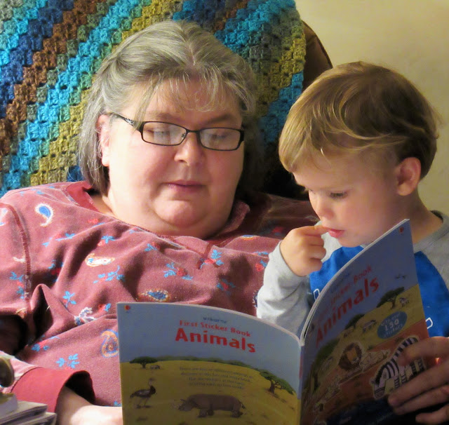 Grandma and Carson sharing a sticker book before he had to head home....