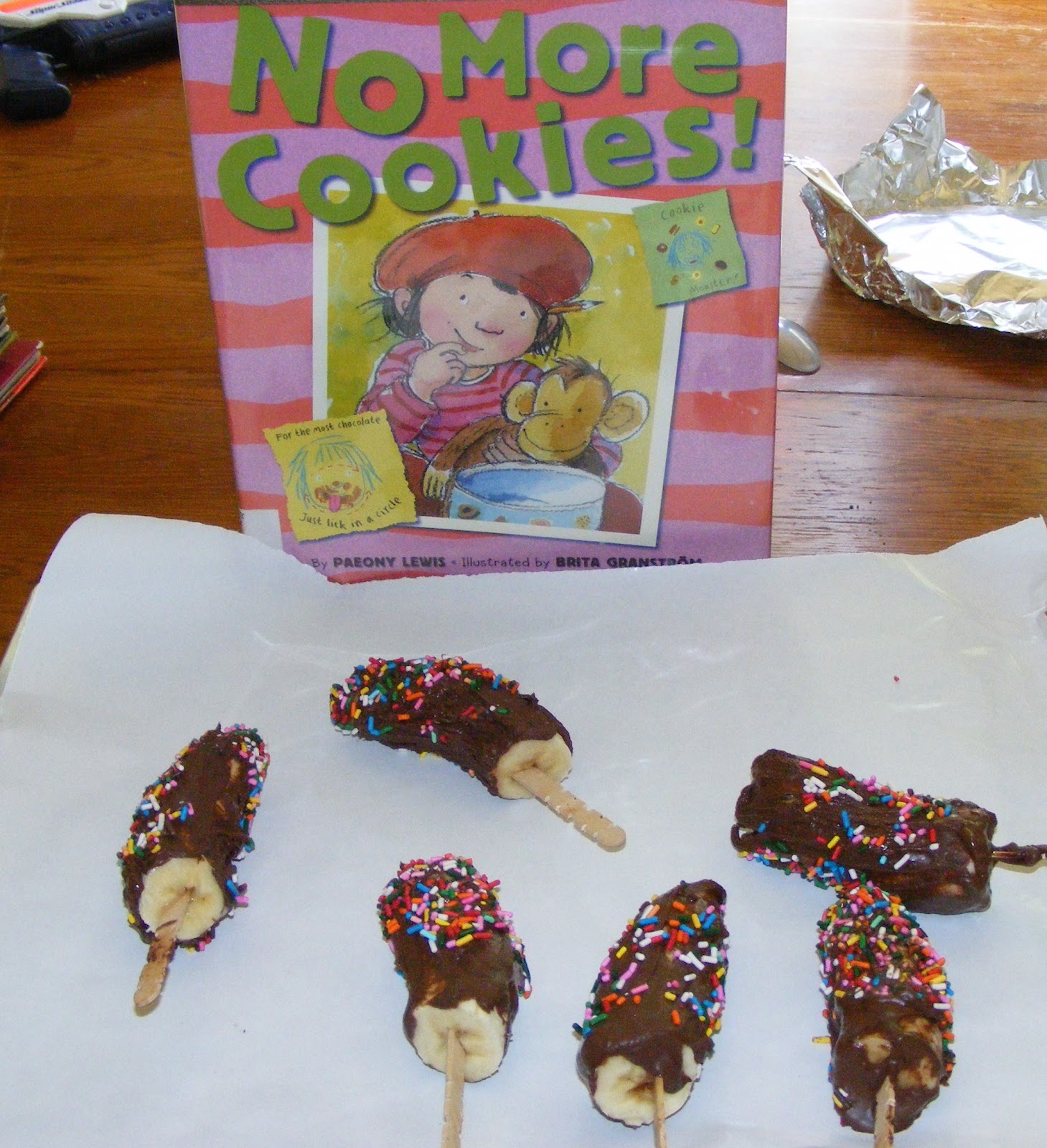 Our first book was No More Cookies! It is a very cute book about a mom who tells her daughter (and her monkey) No More Cookies! But she does suprise them with Magic Monkey Bananas. The recipe is in the back of the book.